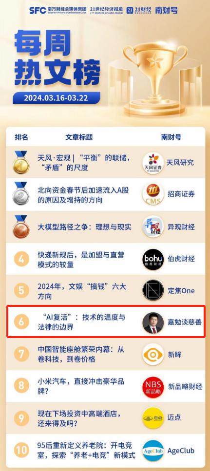 近日,由南方财经全媒体集团主办的每周热文榜(2024.03.16-03.22)公布,我校法学与社会学学院副教授、法学系主任余嘉勉撰写的时事文章《“AI复活”:技术的温度与法律的边界》冲上每周热文榜。