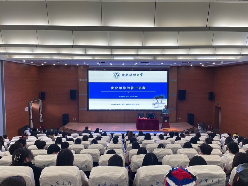 11月19日下午,西华大学法学与社会学学院邀请西南财经大学二级教授、博士生导师高晋康教授莅临西华大讲堂,作题为《优化思维的若干思考》的学术报告。讲座由法学与社会学学院副院长王黎黎教授主持,法学与社会学学院教师、法律硕士研究生、本科生两百余人参加。此次学术报告是我校2024年研究生学术活动月的重要活动,内容丰富,视野宽阔,师生受益匪浅。