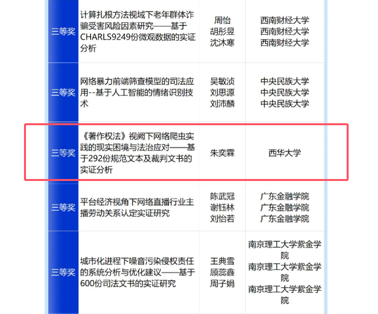 近日,由中国司法大数据研究院主办的第三届“法研灯塔”司法大数据征文比赛正式落下帷幕,我校法学与社会学学院(知识产权学院)2022级知识产权专业本科生朱奕霖的文章《〈著作权法〉视阙下网络爬虫实践的现实困境与法治应对——基于292份规范文本及裁判文书的实证分析》荣获理论研究-本科生组三等奖。