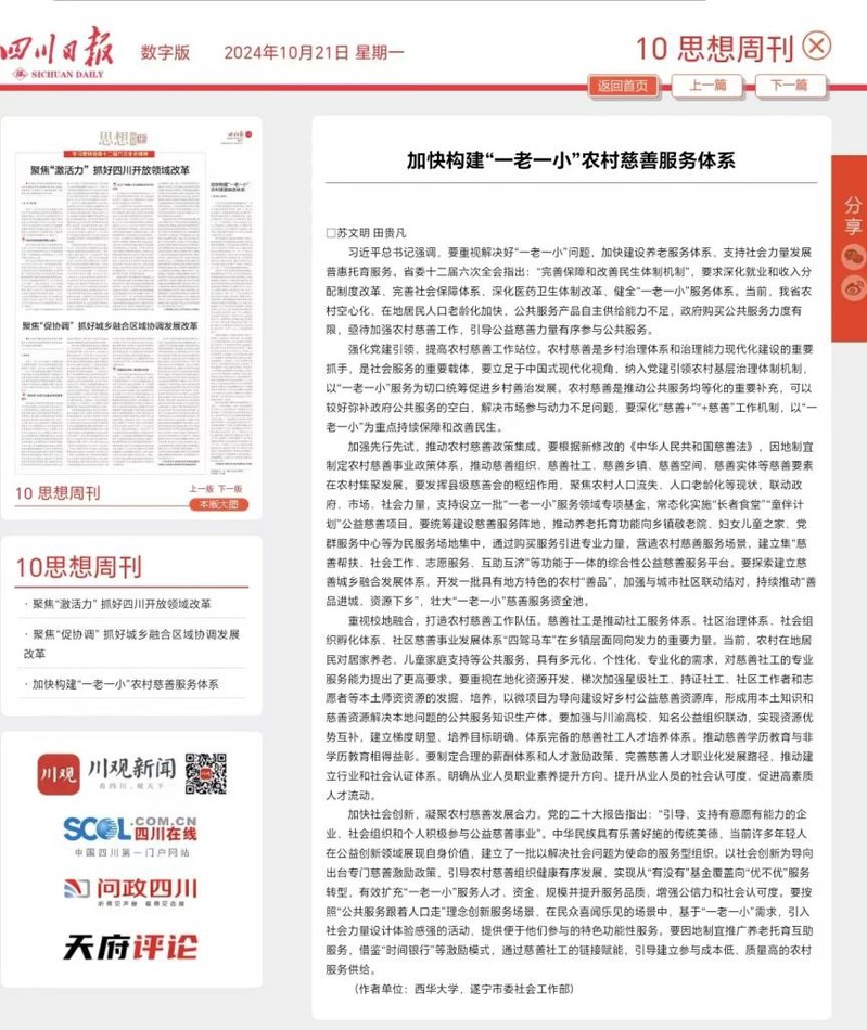 中心服务发展大局、紧扣重点任务,组织研究人员及时开展对策性、前瞻性研究。苏文明教授的理论文章《加快构建“一老一小”农村慈善服务体系》在四川日报(理论版)上刊登,进一步扩大了研究中心在社会政策与公益慈善领域的影响力,为推动乡村振兴和社会福祉事业的发展贡献了理论智慧。廖磊老师的《培养担当民族复兴重任的时代新人》是对新时代人才培养、民族复兴等宏大议题的一次深刻阐述,为中心的研究工作赢得了关注与认可。