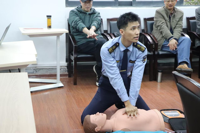 培训伊始,陈教官讲解了急救心肺复苏的主要对象及注意事项,并借助人体模型进行了标准动作示范,对按压深度、位置、频率及人工呼吸动作要领逐一细致说明,全体教师认真聆听。