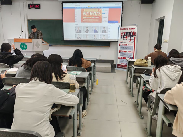 宣讲会上成都瑞达·成致教育的招聘负责人从企业发展历程、核心业务领域、企业文化理念等方面进行了全面介绍,让同学们对企业有了深入了解。在招聘岗位解读环节,负责人重点讲解了不同岗位的工作职责,同时明确了岗位要求。此外,还介绍了企业的薪资福利体系、晋升发展路径及员工培训机制,让同学们对岗位前景充满期待。