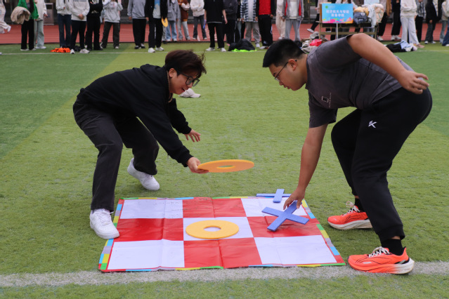 “一圈到底”项目同样充满趣味与挑战。参赛选手各排成一行,当裁判发令后,队员们需快速传递呼啦圈。这极大地考验了队员们的反应速度与协作能力。赛场上,大家脚步灵活,动作连贯,场边观众也为他们加油助威。航空航天与智能装备学院策划的“急速井字棋”,将传统棋类游戏与运动元素相结合,智慧与速度的碰撞让现场氛围愈发热烈。每一次落棋都凝聚着缜密的思考,每一次击掌都传递着彼此的信任,每一次欢呼都洋溢着胜利的喜悦。
