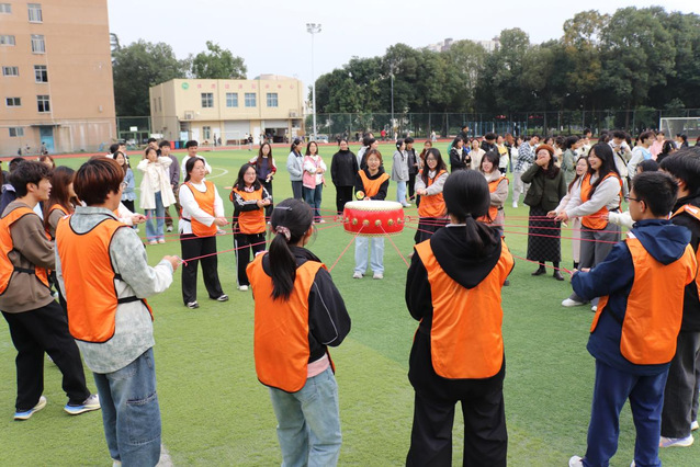 紧随其后的是“鼓动人心”项目,队员们手持鼓绳,眼神专注,相互提醒,现场观众掌声不断。美术与设计学院策划的“流水乒乓”项目,将创意与协作完美融合。比赛中,参赛选手手持U型槽纵向排成一列,合力运输乒乓球。大家全神贯注,生怕乒乓球落地,飞速奔跑的步伐展现着不服输的精神。两轮比拼后,工作人员汇总各队用时,用时最短的队伍斩获高分。队员们欢呼雀跃,尽情享受胜利的喜悦。