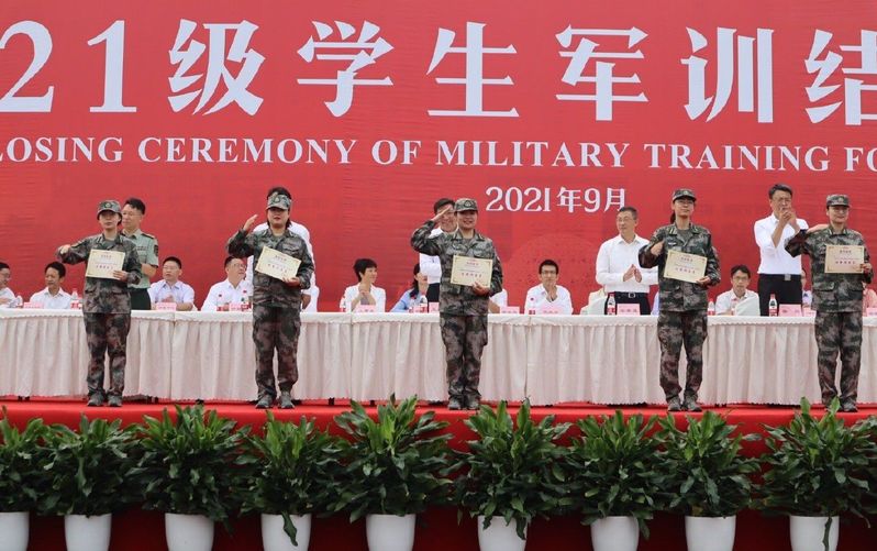 紧接着,所有参训人员合唱《强军战歌》。军训工作领导小组组长为优秀连队学生和教官进行表彰,同时也鼓励西华学子发 扬军训吃苦耐劳的精神。