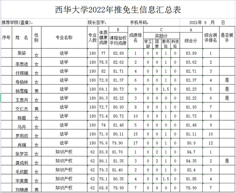 法学与社会学学院2022年免试攻读硕士研究生人员名单汇总公示