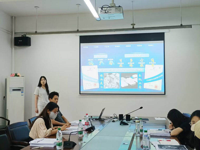 赛事采用PPT汇报形式,七个参赛团队依次进行5分钟项目展示,内容涵盖项目背景、目标、实施意义、需求评估及项目进程等核心要素。评委依据项目策划书质量、PPT展示效果及现场答辩表现进行综合评分。各参赛团队以饱满的精神状态和专业的答辩能力,充分展现了学院学子的创新风采。其中,选择化学赛道的光净界——纳米SnO₂高效光催化降解有机污染物系统项目表现亮眼。该项目负责人从项目背景、产品介绍、核心竞争力、市场分析以及商业模式等方面,详细阐述了在环境治理领域的技术突破。赛后点评环节中,辅导员齐鑫从项目质量、现场表现和计划书撰写三方面提出建设性意见。她特别强调,项目展示需注重逻辑性、突出核心亮点,并且建议通过充分演练提升呈现效果。同时她也鼓励学生以竞赛为契机,持续深化创新创业能力培养。