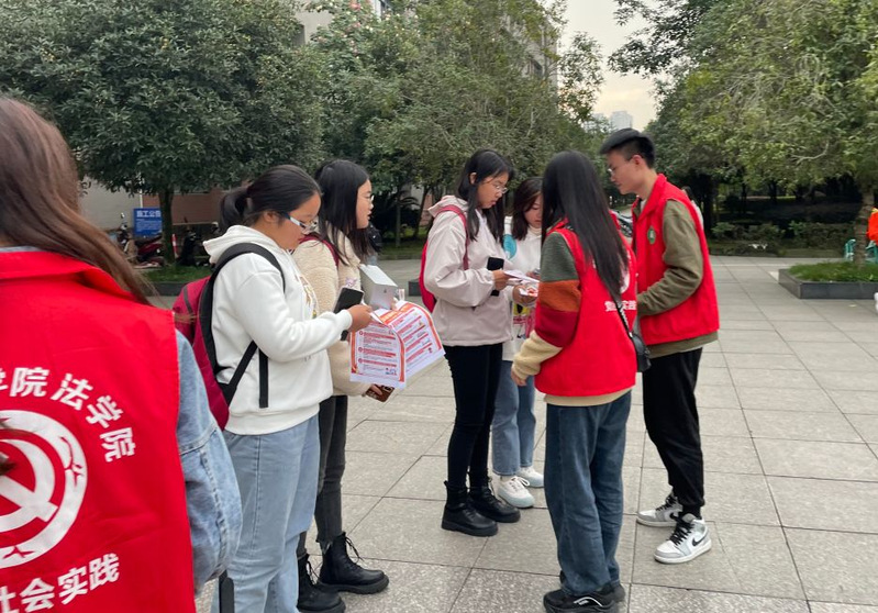 学员们踊跃参与,耐心细致的为西华大学的同学们作讲解,同学们都认真仔细地听着,感悟颇深,用心体会着民法典的魅力,大家对宣传单中涉及到的高空抛物被砸伤、高铁霸座等实用性民法典新增容很感兴趣。