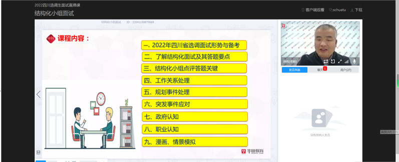 首先,孙伟老师介绍了本次讲座的时间为14-17日,每天晚上3个小时,内容主要围绕四川省选调生面试形式,考试方向,面试题型特征和答题技巧等方面展开;接下来,孙伟老师对四川省选调生面试的五大常规题型进行了详细的梳理和讲解,并通过与同学们的积极互动传递知识;最后,通过真题演练分析同学们答题的不足之处,并向同学们分享提分技巧。