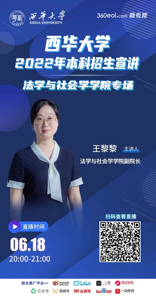 618日,法学与社会学学院副院长王黎黎教授应邀参加西华大学2022年本科招生直播宣讲活动,在网络直播平台与1000多名考生和家长面对面交流,开展法学与社会学学院的专业推荐。