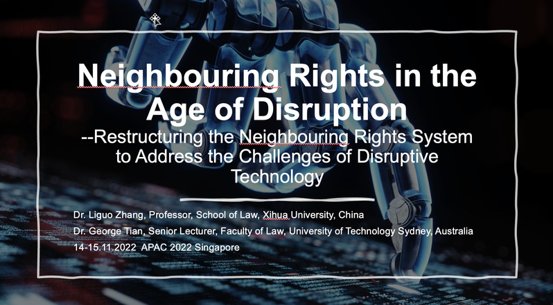 11月14-15日,亚洲太平洋版权协会(APCA)2022国际学术会议在新加坡国立大学法学院通过线下和线上混合方式举办,今年会议的主题是“Copyright in the Age of Disruption”。我校知识产权学院张利国教授和悉尼科技大学高级讲师田一钧博士合著的论文被大会录用,并受邀参会作报告。因疫情原因无法赴新加坡参会,在线上参会并以““Neighbouring Rights in the Age of Disruption - Restructuring Neighbouring Rights System to Address the Challenges of Disruptive Technology”为题作报告。报告中提出重构邻接权体系以应对颠覆性技术对现有版权体系带来的冲击和挑战的方案。此次会议还邀请到世界知识产权组织总干事Daren Tang先生做主题报告。