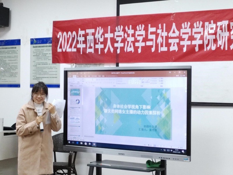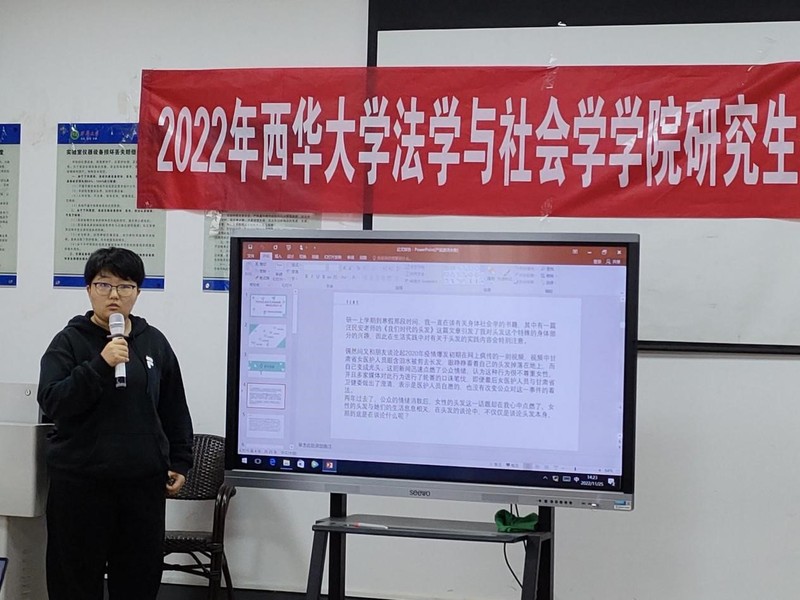 首先,研究生张荣茹以《当女性谈论头发的时候,他们在谈论什么——基于S美发店的田野调查》为题,围绕“女性的头发是如何影响女性的社会建构”这一问题展开论述,认为公众要提高对女性的包容度。以现代社会网络飞速发展为背景,研究生蒲月琴提出《身体社会学视角下影响聊天类网络女主播的动力因素探析》的课题,分析了聊天类网络女主播的行为特征、受众对象的多样化需求以及网络女主播资本转化的问题。研究生王阳在《以儿童议事会为例探讨社区治理中的儿童参与》的课题研究中简要讲述了一例儿童议事会的案例并由此引出两点总结,一是观察学习在提升参与意识方面发挥了积极作用,二是儿童自主发现议题难,参与依赖成人的推动,参与能力低。报告完毕后,韦丽明老师和杨明华老师对三位报告人的分享做了总结并提出了议题应切近文化现象、加强理论层次的深入等建议。