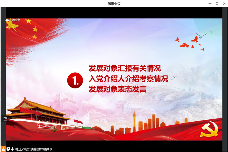 本次会议应到正式党员21 名,发展对象13名,实到会正式党员21名,发展对象13名,有表决权的到会人数超过应到会有表决权人数的半数,符合规定人数,可以开会。本次会议分为两个部分:第一,发展对象转为预备党员大会。具体按以下四个流程进行:发展对象宣读成为预备党员申请、入党介绍人介绍其考察情况、发展对象表态发言、正式党员进行投票表决。第二,召开十二月党组织生活会。