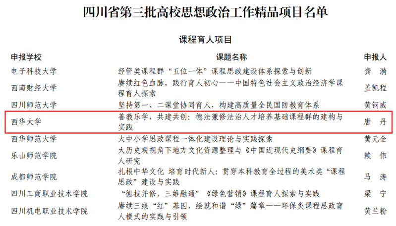 近日,四川省教育厅公布第三批全省高校思想政治工作精品项目评选结果,我校法学与社会学学院唐丹副教授及其团队的申报项目《善教乐学,共建共创:德法兼修法治人才培养基础课程群的建构与实践》获批全省高校思想政治工作课程育人精品项目。