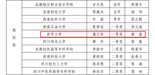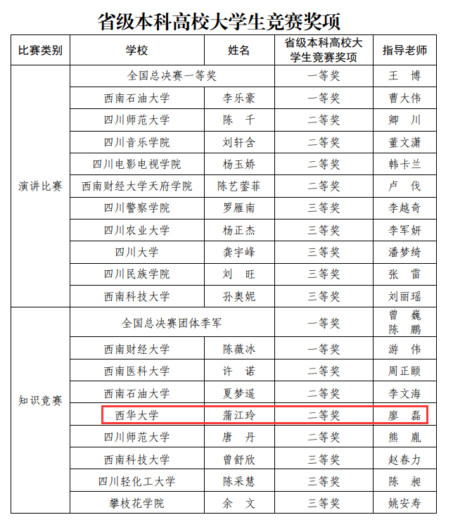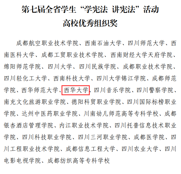 近日,由四川省委教育工委、教育厅组织的第七届全省学生“学宪法 讲宪法”系列活动中,我校法学与社会学学院廖磊老师指导的学生蒲江玲在第七届全省学生“学宪法 讲宪法”活动省级决赛知识竞赛荣获高校组一等奖、在省级本科高校大学生竞赛荣获知识竞赛类二等奖。此外,我校荣获第七届全省学生“学宪法 讲宪法”活动高校优秀组织奖。