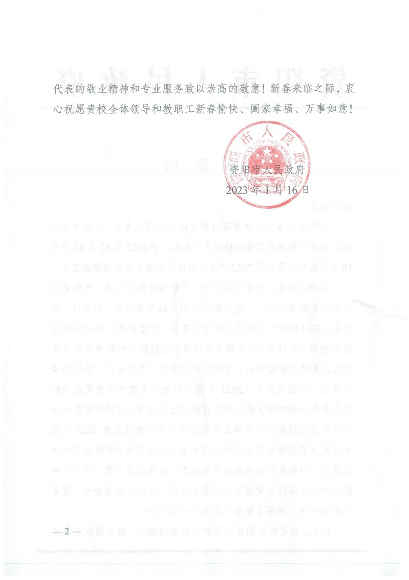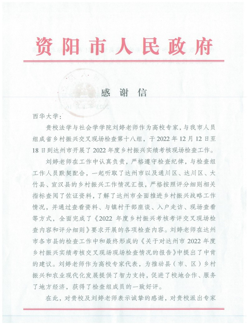 近日,学校收到来自资阳市人民政府的一封感谢信,对西华大学和法学与社会学学院刘婷副教授作为2022年度乡村振兴考核考评交叉现场检查评分高校专家的工作表示衷心感谢。